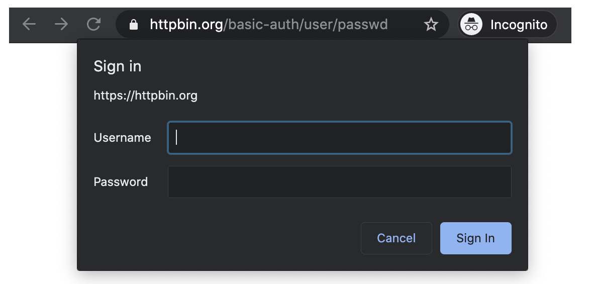 - Trình duyệt nhận thấy có www-authenticate trong header trả về, sau đó hiện thị hộp thoại cho thông tin đăng nhập (thường thấy là hộp thoại hiện lên trên cùng bên phải trang web)