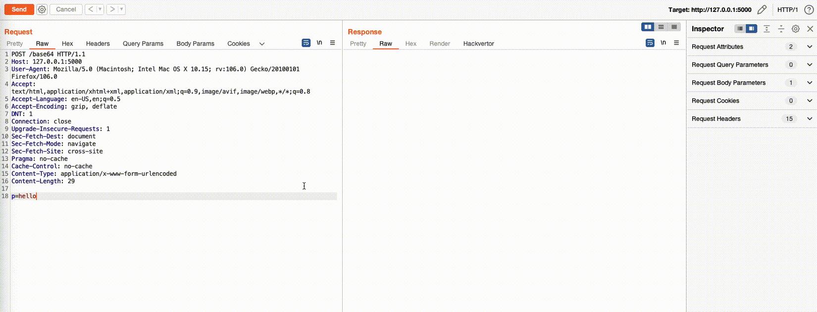 Hackvertor còn hỗ trợ việc nesting (lồng nhau) của các tag. Nghĩa là nếu payload của chúng ta cần phải biến đổi qua một chuỗi các biến đổi từ A -> B -> C thì ta có thể lồng các tag này lại theo đúng thứ tự như trên. VD như endpoint dưới yêu cầu truyền vào payload theo biến đổi: