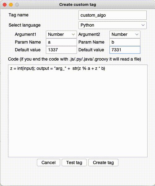 Như ở đầu bài mình có nhắc đến, thì Hackvertor cho phép chúng ta tạo custom tag, nhận các tham số và có thể được viết bằng các ngôn ngữ: Python (cần cài thêm JPython), Java, Javascript và Groovy. Tính năng thực thi code của tag mặc định là tắt nên trước hết, ta cần tích vào Allow code execution tags: