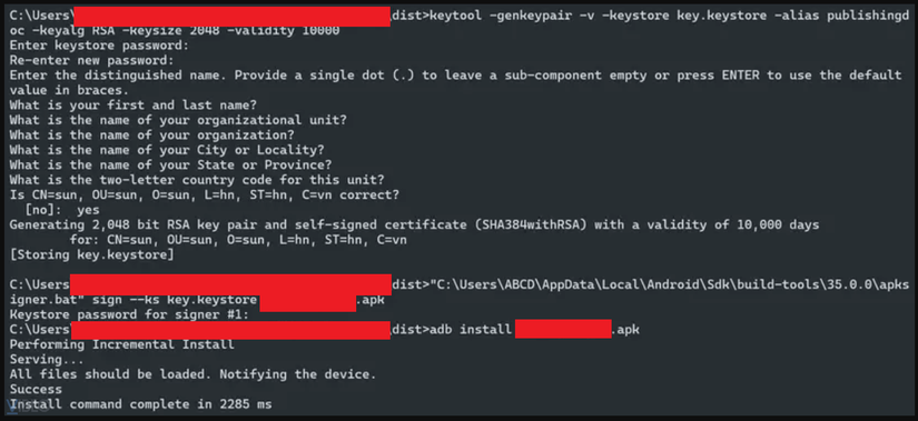 Chạy lần lượt các lệnh sau để tạo ra tệp tin apk mới.