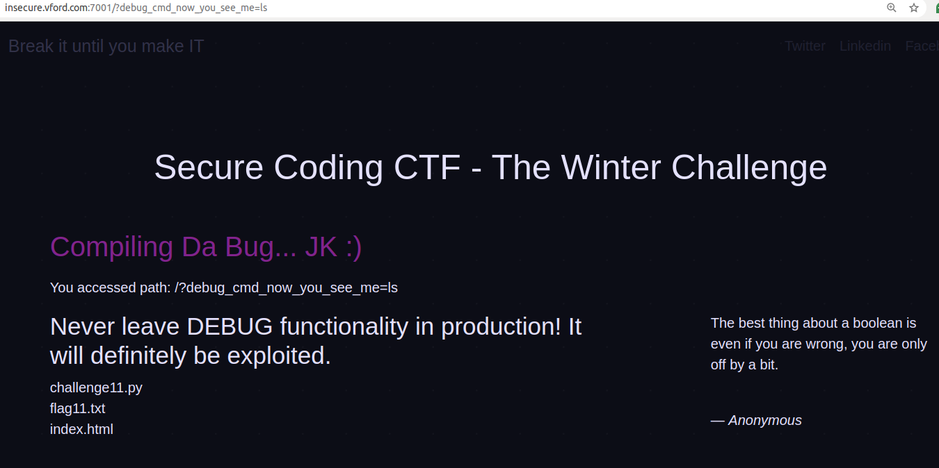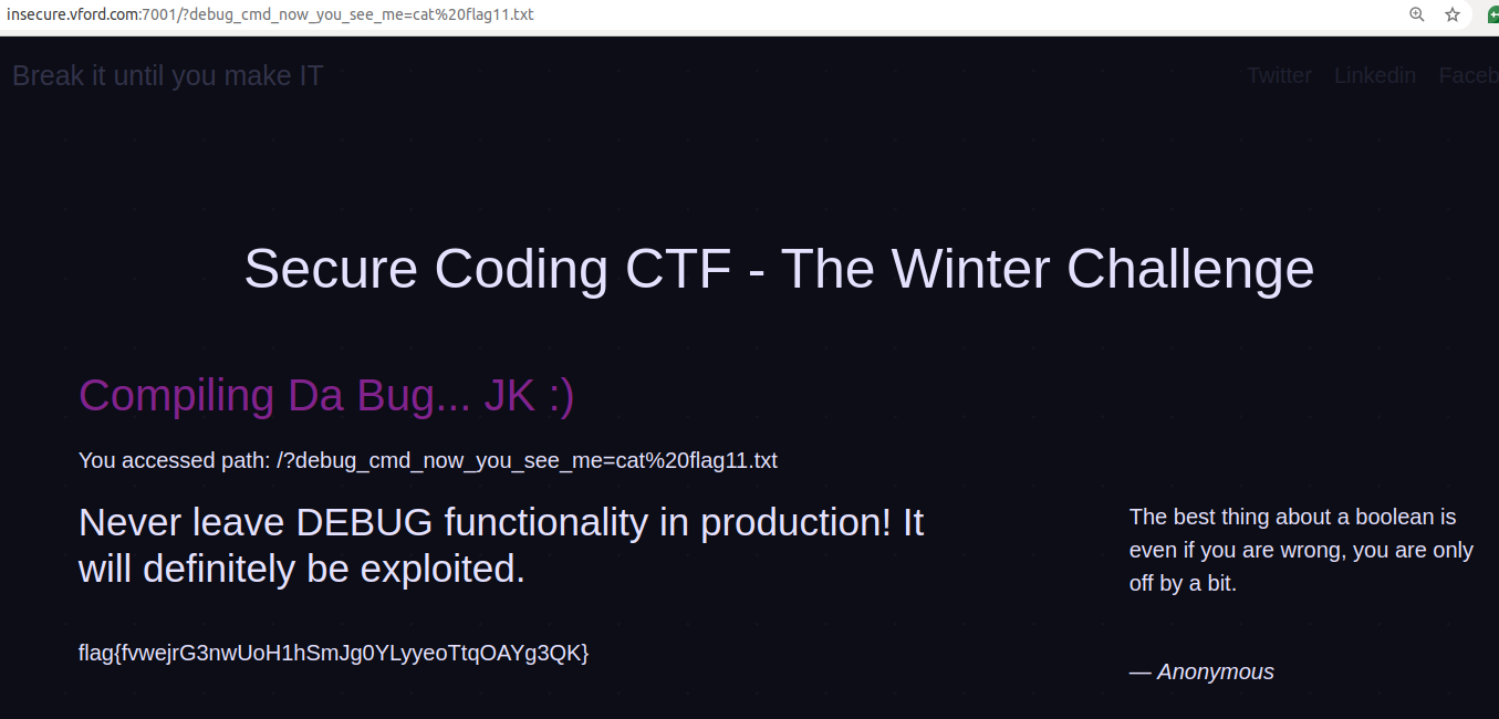 Khi đã có danh sách các tệp tin rồi thì chỉ cần đọc file flag11.txt là được. Làm tương tự như trên, để thực thi lệnh cat chúng ta truyền param: ?debug_cmd_now_you_see_me=cat flag11.txt