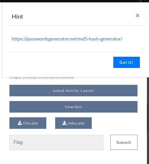 Đến đây, hoặc là chúng ta có thể xem gợi ý, hoặc là chúng ta có thể đoán, hoặc thử với các thuật toán hash thông dụng. Kết quả: thuật toán hash được sử dụng là MD5. Khi biết là MD5 rồi, thì chúng ta tiếp tục thử hash với các yếu tố đã đề cập ở trên. Và tất nhiên không ngoài dự đoán, ID này là hash tên tệp tin bằng MD5 rồi lấy 13 ký tự đầu của output.