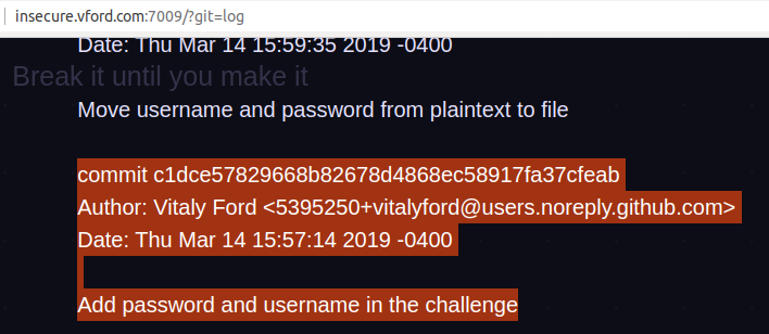 Khi truyền vào param /?git=log, chúng ta có toàn bộ lịch sử commit với thứ tự gần nhất - xa nhất. Sau khi tìm ngược từ dưới lên, chúng ta có thể thấy ngay 1 commit đặc biệt có lời nhắn "Add password and username in challenge"