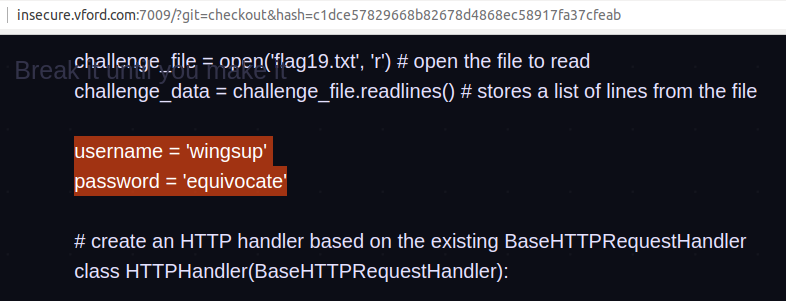 Bây giờ chúng ta sẽ copy hash id để xem nội dung commit này có gì bằng cách sử dụng param /?git=checkout&hash=c1dce57829668b82678d4868ec58917fa37cfeab. Dễ dàng tìm được username và password ngay trong code.