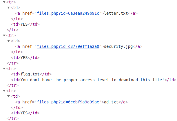Ở bài này chúng ta không cần mã nguồn để làm chỉ cần xem giao diện web là được. Và đây là giao diện web, chỉ có 1 bảng với tên file và thông tin về quyền truy cập. Tệp tin nào có thể truy cập được thì sẽ hiện màu tím và có chữ "YES" bên cạnh, tệp tin nào không truy cập được thì sẽ có chữ màu trắng.