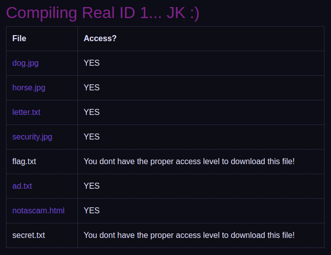 Cách làm bài này tương tự với bài Real ID 1. Tuy nhiên lần này lập trình viên đã gắn ID cho tệp tin tốt hơn. ID không còn dùng các số tự nhiên tăng dần nữa, thay vào đó sử dụng 1 đoạn mã 13 ký tự gồm số ký tự số và ký tự in thường