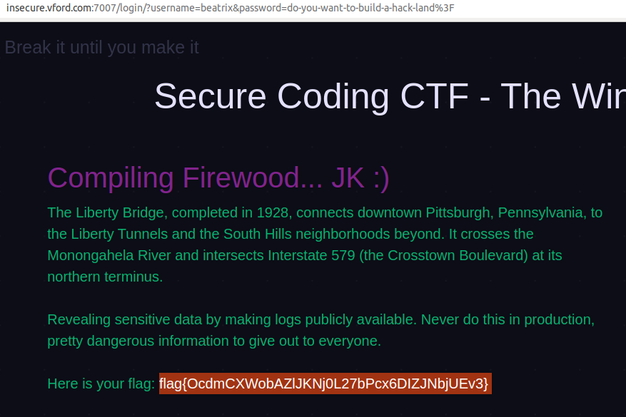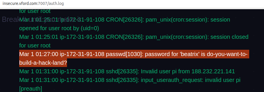 Như vậy thì rõ rồi, khi truy cập đường dẫn /auth.log thì server sẽ không kiểm tra quyền gì cả, mà sẽ đọc luôn file auth.log và trả về kết quả cho chúng ta. Sau khi truy cập thì mình tìm được một cặp username/password là beatrix/do-you-want-to-build-a-hack-land?
