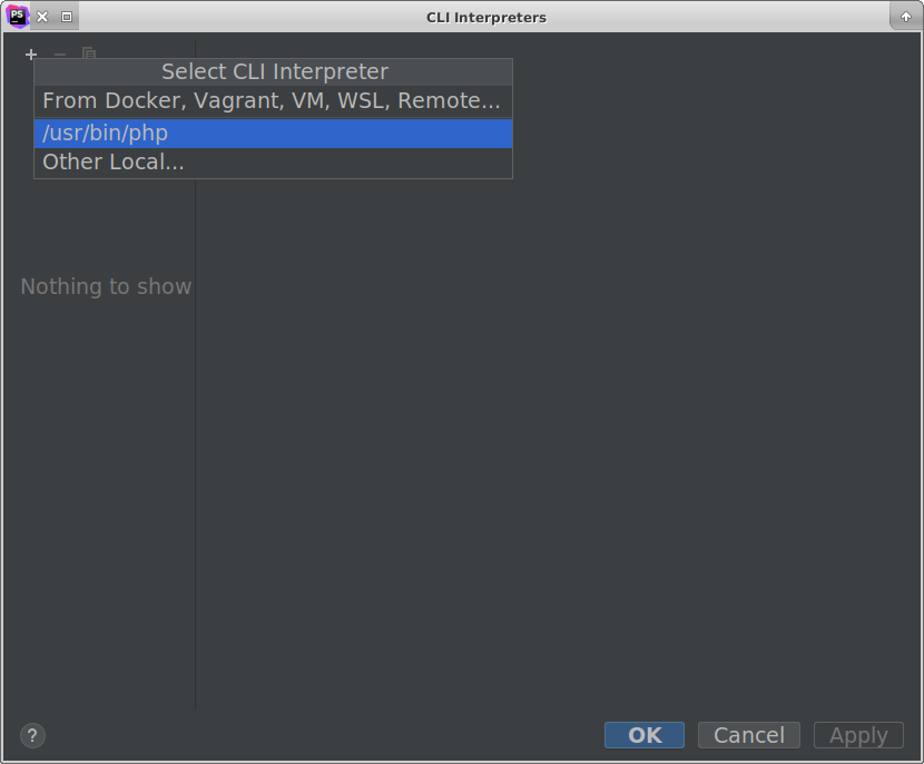 Nếu tại phần CLI Interpreter chưa thấy hiện gì, ta cần cài đặt nó thủ công bằng cách chọn vào ... sẽ hiển thị lên 1 cửa sổ. Chọn tiếp vào dấu + và chọn vào đường dẫn file thực thi của php-cli, nếu không thấy đường dẫn file thực thi chọn Other Local... để chọn thủ công.