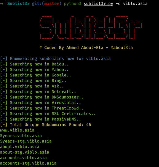 python3 sublist3r.py -d viblo.asia
