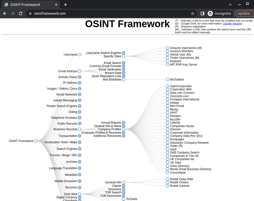 Một nơi khá là phù hợp để bắt đầu là OSINT Framework (https://osintframework.com), một framework được tạo bởi Justin Nordine. Khung này cung cấp các liên kết đến các nhóm các tài nguyên cho rất nhiều nhiệm vụ từ thu thập địa chỉ email đến tìm kiếm phương tiện truyền thông xã hội hoặc deepweb. Mỗi đường dẫn là một liên kết mở rộng các kỹ thuật thu thập thông tin cho một chủ đề cụ thể, chẳng hạn như tên người dùng, địa chỉ e-mail, địa chỉ IP, hồ sơ kinh doanh, hồ sơ công khai, số điện thoại, v.v.
