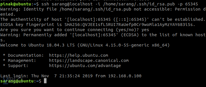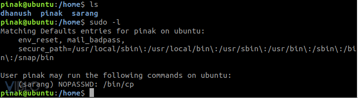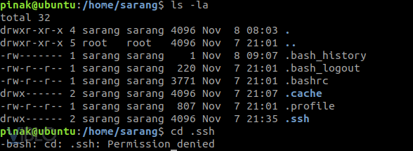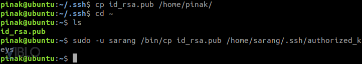 pinak@ubuntu:~/.ssh$ sudo -u sarang cp id_rsa.pub /home/sarang/.ssh/authorized_keys