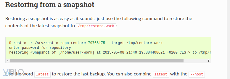 Ngon, lưu snapshot được về máy mình rồi, điều quan trọng giờ là tìm lệnh để đọc nó ra thôi. Ngồi cat mấy cái folder trong /tmp/restic mà nó mã hóa hết luôn. Ngồi đọc doc thấy đoạn này, hóa ra là nó dùng restore chứ nó k phải kiểu mở ra rồi đọc được.