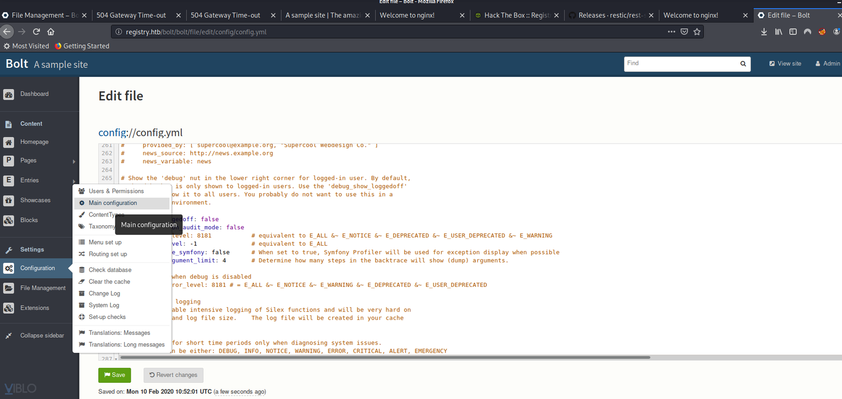 1|admin|$2y$10$e.ChUytg9SrL7AsboF2bX.wWKQ1LkS5Fi3/Z0yYD86.P5E9cpY7PK|bolt@registry.htb|2020-02-09 23:27:11|10.10.15.117|Admin|["themes://basic.php","themes://rev.php","themes://base-2018/meh.twig","themes://meh.twig","themes://shell.php"]|1||||0||["root","everyone"]