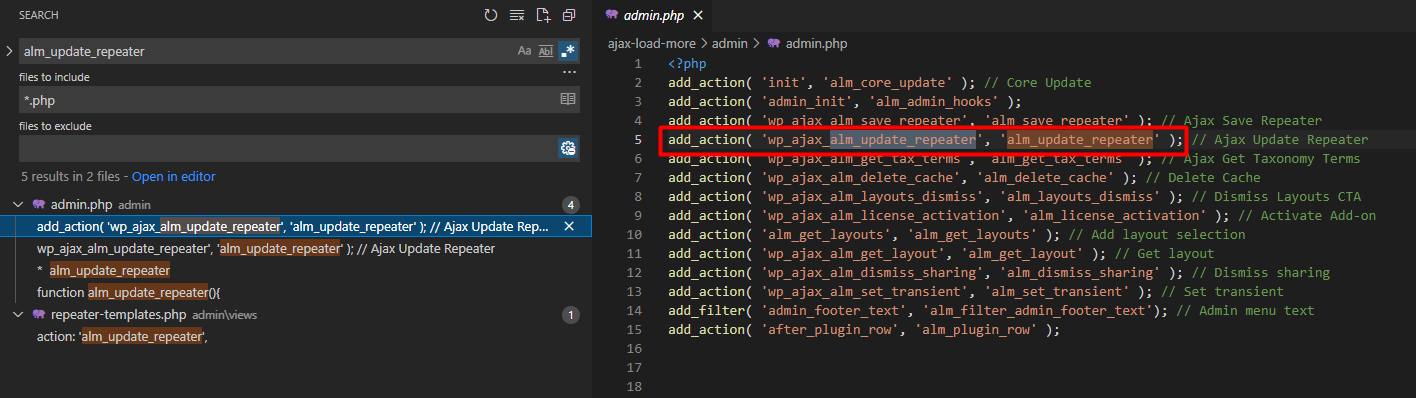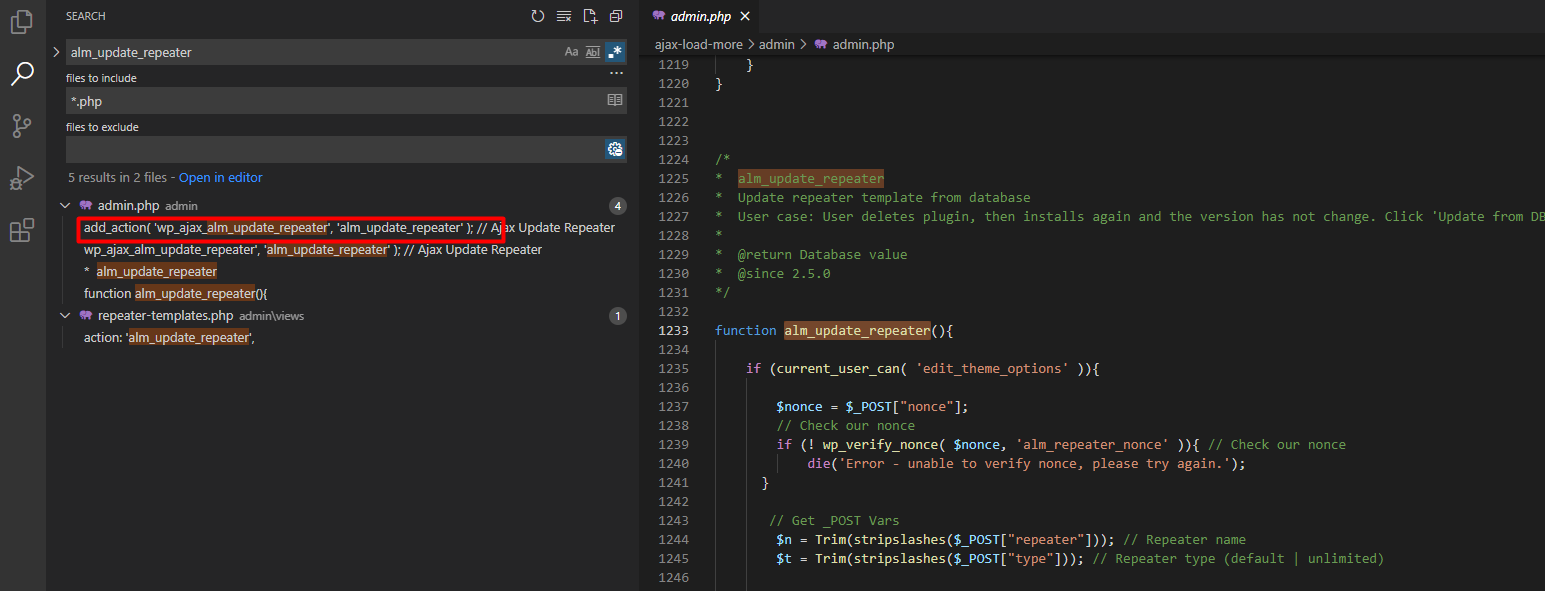Đây thì thì mình rất chắc chắn và tin rằng lỗi có thể xảy ra. Tiếp theo là làm sao để gọi được hàm này trên web. Lên trên một tí mình thấy rằng code được bao bởi hàm alm_update_repeater. Mình lại tìm cum từ này trong source code xem có nơi nào gọi đến không.