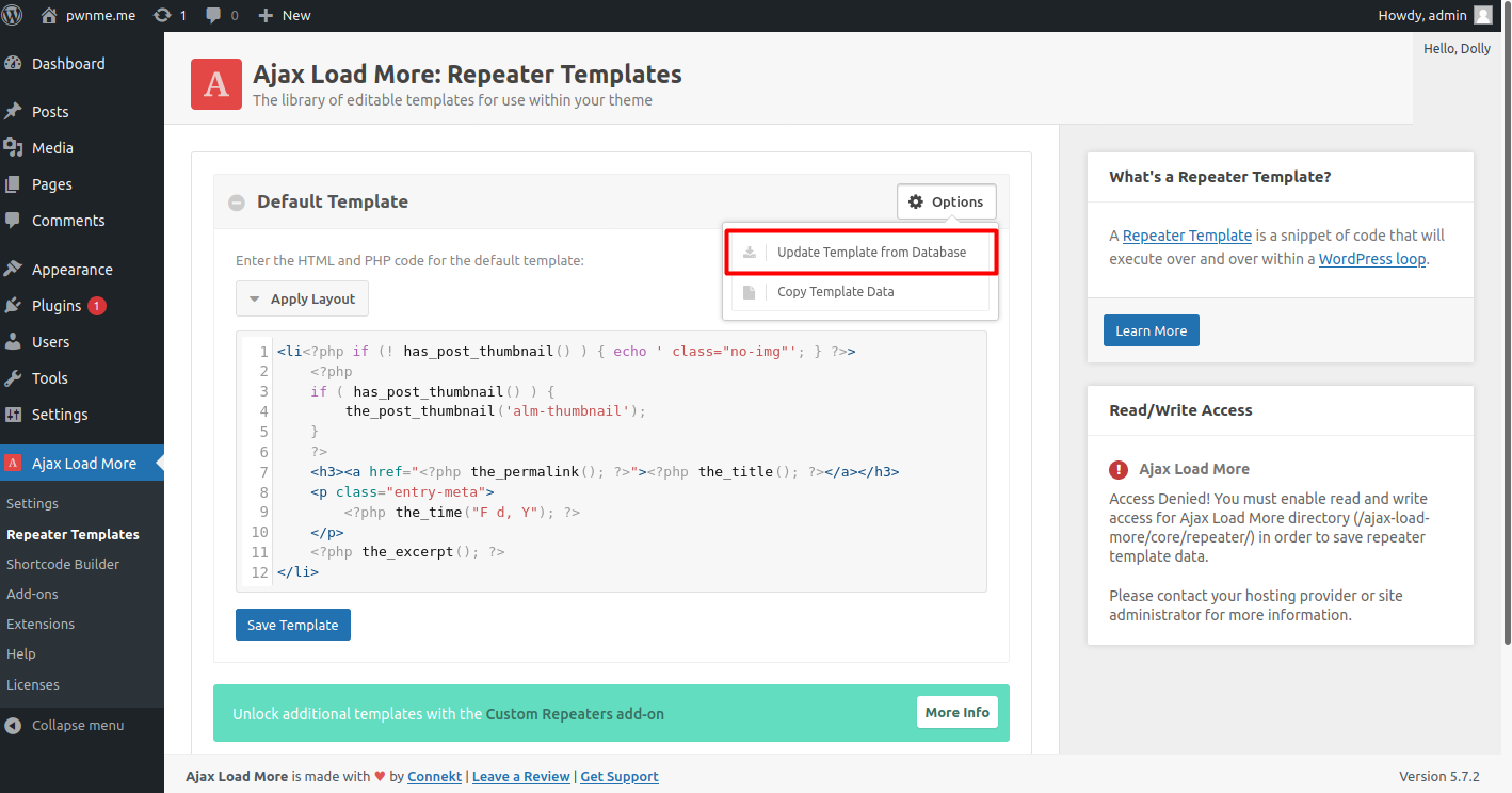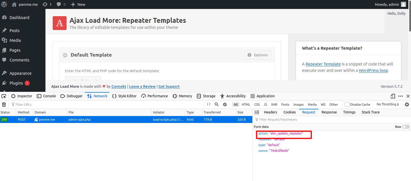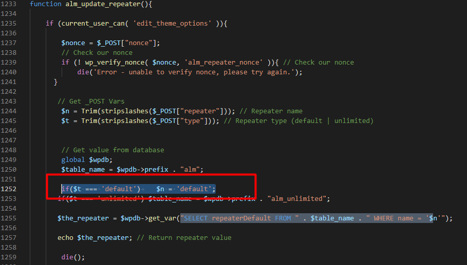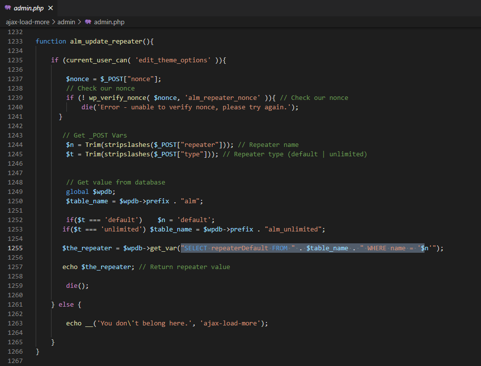 Đầu tiên, khi nhìn vào đoạn code được high light thì nghĩ rằng có thể có lỗi. Mình đặc biệt vào biến $n và tìm xem biến này được lấy từ đâu. Nhìn lên trên một tí tại dòng 1244 trong ajax-load-more/admin/admin.php thì biến $n được gán bằng Trim(stripslashes($_POST["repeater"])).