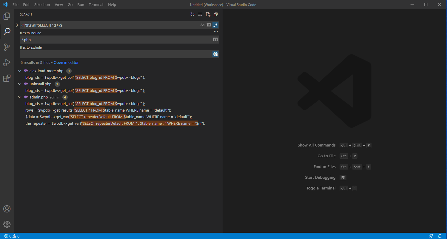 Với đoạn REGEX này ta thu được 6 kết quả, đây là số lượng rất ít từ đó giảm thời gian đọc và phân tích của mình. Khi nhìn vào các kết quả vừa thu được mình nhận ra rằng thực ra chỉ có một kết quả cần phải kiểm tra. Các bạn có nhìn thấy không? Đó là kết quả mà trong câu truy vấn có chứa biến (chứa biến thì mới có khả năng người dùng kiểm soát được giá trị của câu truy vấn).