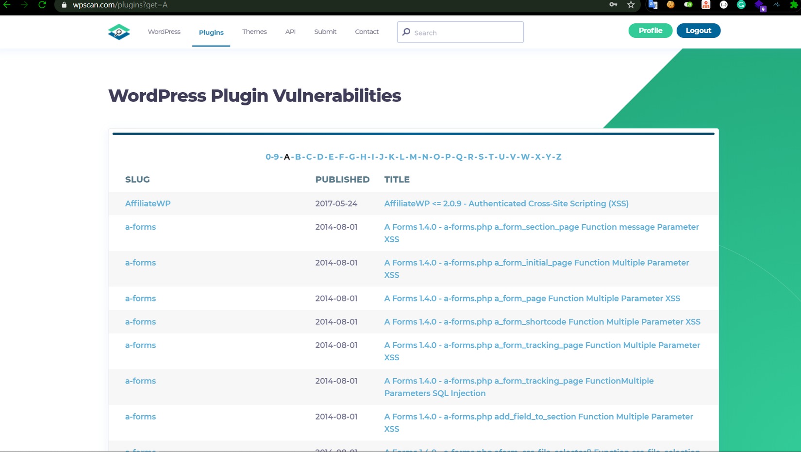 Trên hình là giao diện mới của wpscan nhìn đẹp so với giao diện trước đây. Nhưng giao diện trước đây lỗi được hiển thị theo thời gian nên dễ dàng biết được các lỗi mới được submit. Còn như bây giờ thì lỗi được nhóm theo chữ cái nên không tiện cho việc theo dõi các lỗi mới.