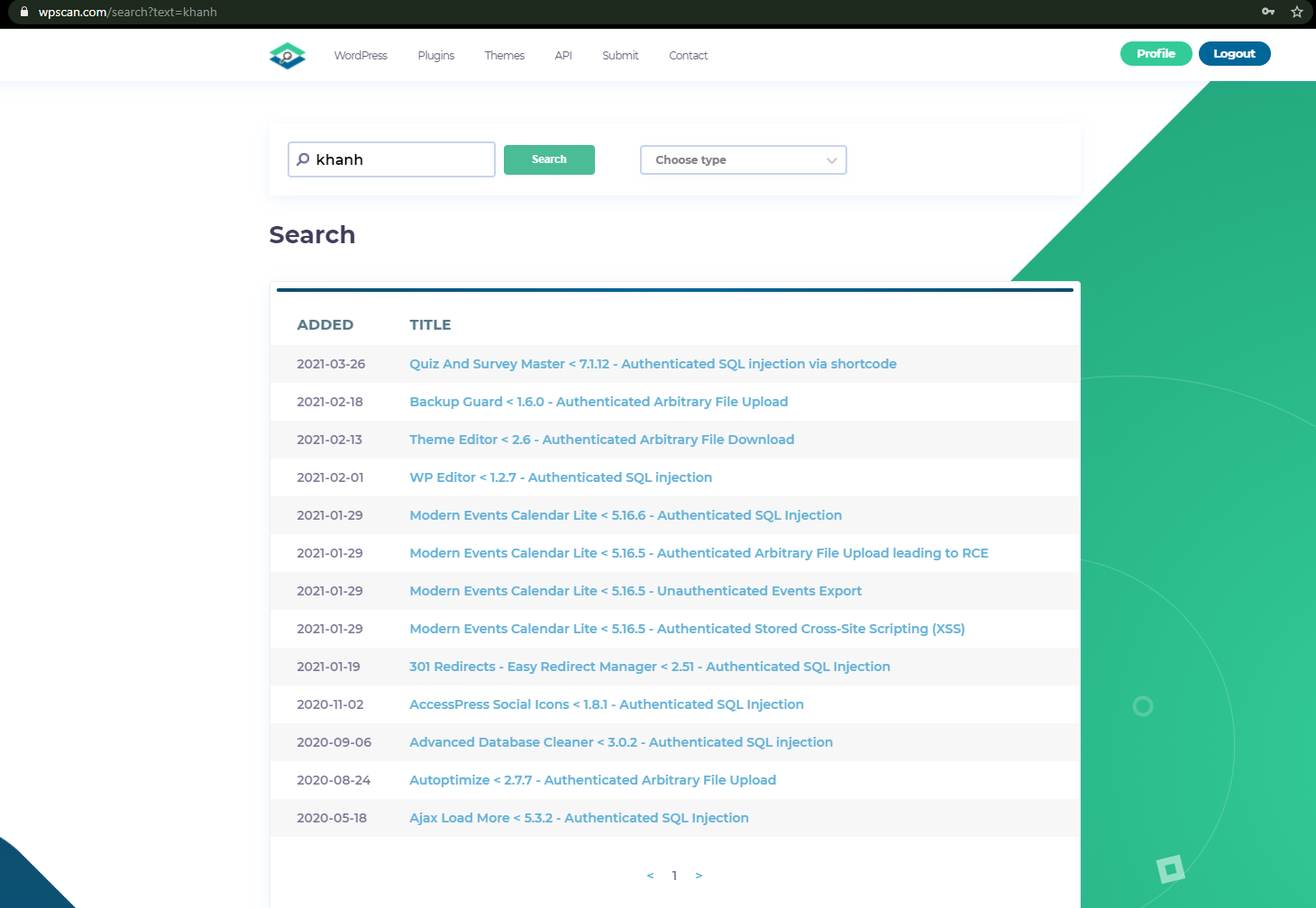 Để kiếm ví dụ cho bài viết này mình lấy lại những lỗi mình đã tìm được trước đây. Mình vào trang wpscan và tìm kiếm với tên của mình.