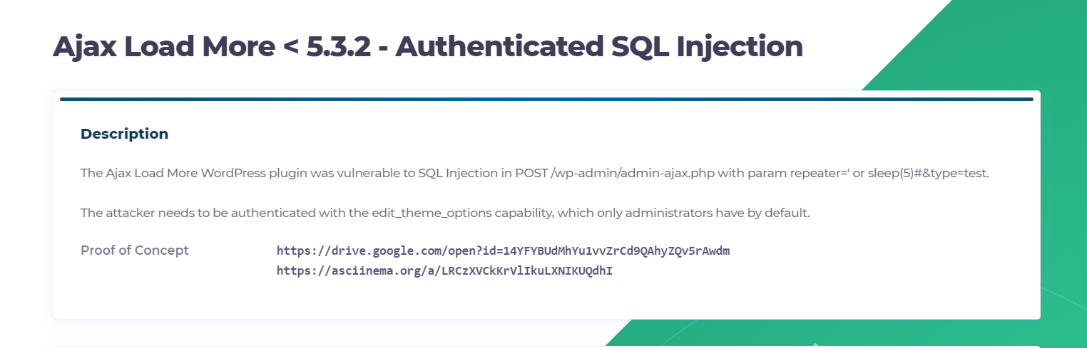 Sau khi xem lại các lỗi mình đã tìm, mình quyết định chọn Ajax Load More < 5.3.2 - Authenticated SQL Injection làm ví dụ cho bài hôm nay. Có lẽ sẽ có một vài bạn thắc mắc là tại sao mình lại chọn cái này?