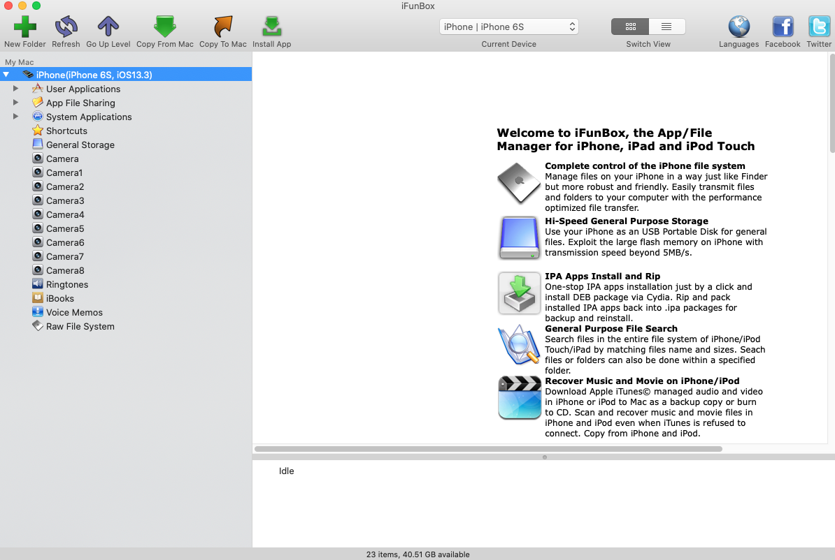 Một công cụ khá hay cho phép truy cập vào tài nguyên của thiết bị iOS, xem các file của app, cài đặt app, download file... Có thể tải về tại đây. Giao diện của nó sẽ như thế này:
