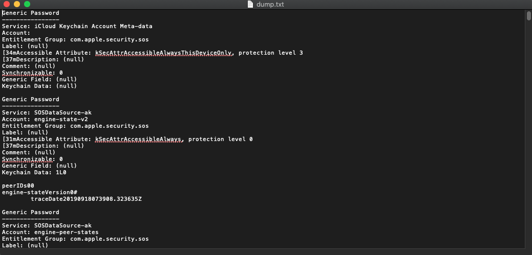 Là công cụ giúp dump Keychain của thiết bị iOS để tìm kiếm các thông tin có thể khai thác được trong này. (Keychain là 1 tính năng của Apple, dùng để lưu trữ các thông tin nhạy cảm một cách an toàn). Nếu các thông tin lưu trong này không được mã hoá, hoàn toàn có thể bị kẻ tấn công đọc được trên thiết bị đã jailbreak. Nội dung file keychain sẽ trông như thế này: