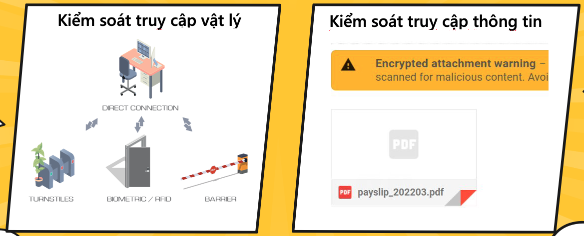 - Kiểm soát truy cập vật lý: là các rào chắn, cửa, nhân viên kiểm tra thẻ,... bảo vệ trước các truy cập vật lý.