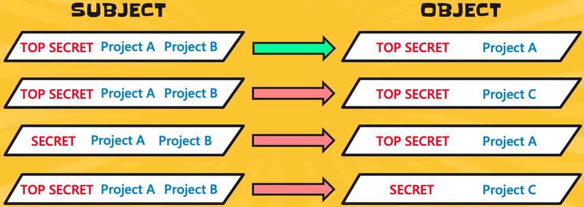 - Phân loại của chủ thể có cấp độ lớn hơn hoặc bằng với cấp độ phân loại của đối tượng, và nhãn danh mục thoả mãn => được phép truy cập.