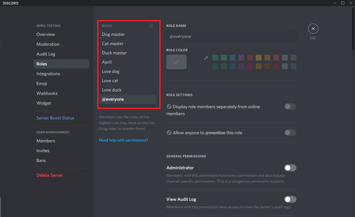 Một ví dụ khác là trong ứng dụng discord, người tạo server có thể tạo và cài đặt quyền truy cập kênh trong server cho các vai trò cụ thể. Và ngoài các vai trò tạo thêm ra thì luôn có một vai trò mặc định được cấp cho bất cứ thành viên nào tham gia server, là vai trò every one.