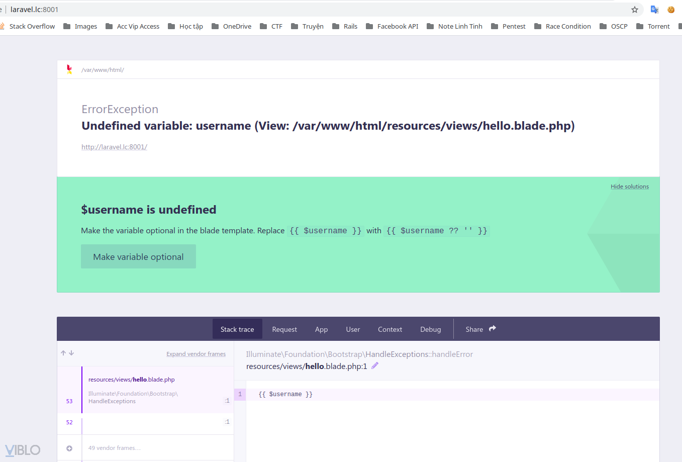 Ở đây mình có 1 file hello.blade.php có nội dung là {{ $username }}, nếu sử dụng một biến mà không được define thì nó sẽ trả về một lỗi như hình bên trên. Khi ta click vào Make variable Optional thì nó sẽ tự động replace {{ $username }} thành {{ $username ? '' }}. Kiểm tra log thì ta thấy được request như sau: