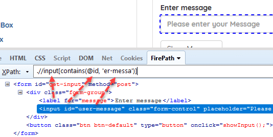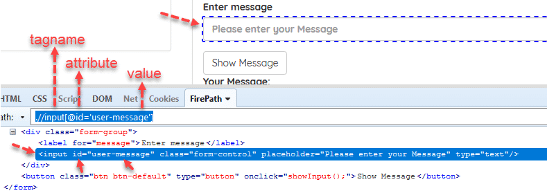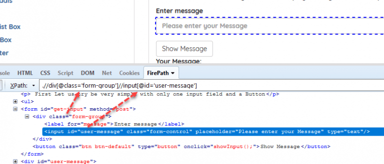 Example: //div[@class=’form-group’]//input[@id=’user-message’]