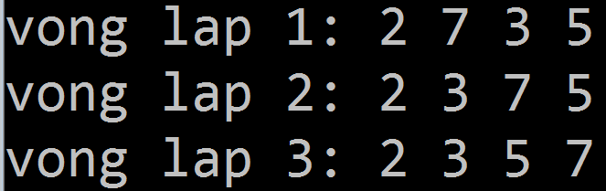 [2 3 7 5] -> [2 3 5 7], tìm được 5 là số nhỏ nhất trong dãy từ 3-n ta đổi chỗ 5 cho 7