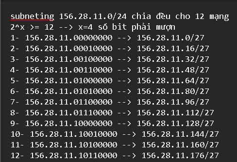 Ví dụ: chia mạng 156.28.11.0/24 chia đều cho 12 mạng:
