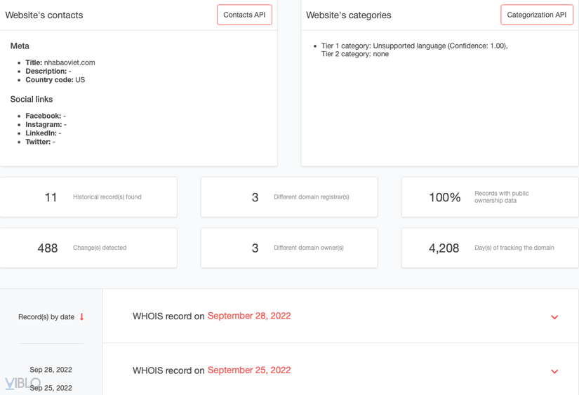 Chúng ta sẽ chọn mục Build Historic WHOIS report để xem thông tin đăng ký tên miền trong lịch sử. Chờ một chút thôi là các thông tin đã được thống kê và liệt kê đầy đủ theo thời gian gần nhất tới xa nhất.