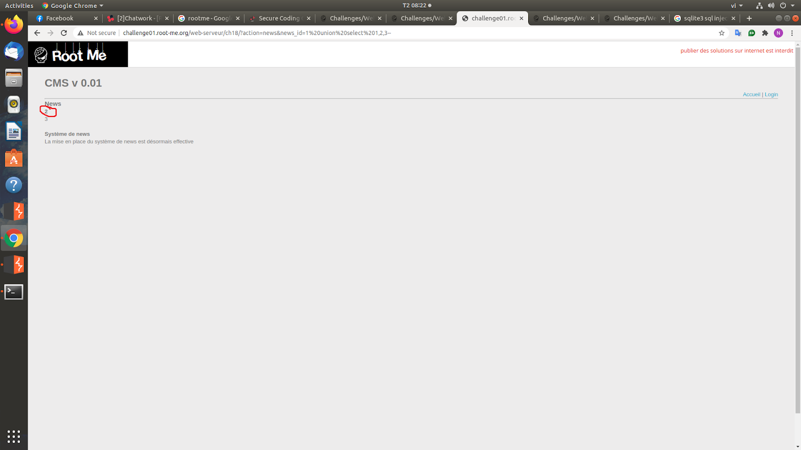 Về cách khai thác của bài này khá giống với bài String bên trên. Tuy nhiên bài này lỗi sqli xảy ra khi ta GET dữ liệu nên ta có thể khai thác trực tiếp trên url. Trước hết vào Trang Système de news. Nhìn trên url sẽ có action=new&new_id=1. Thêm ký tự ‘ vào sau số 1 sẽ xuất hiện lỗi.