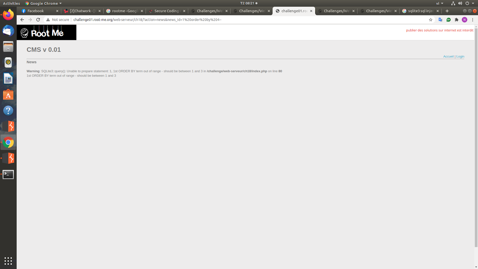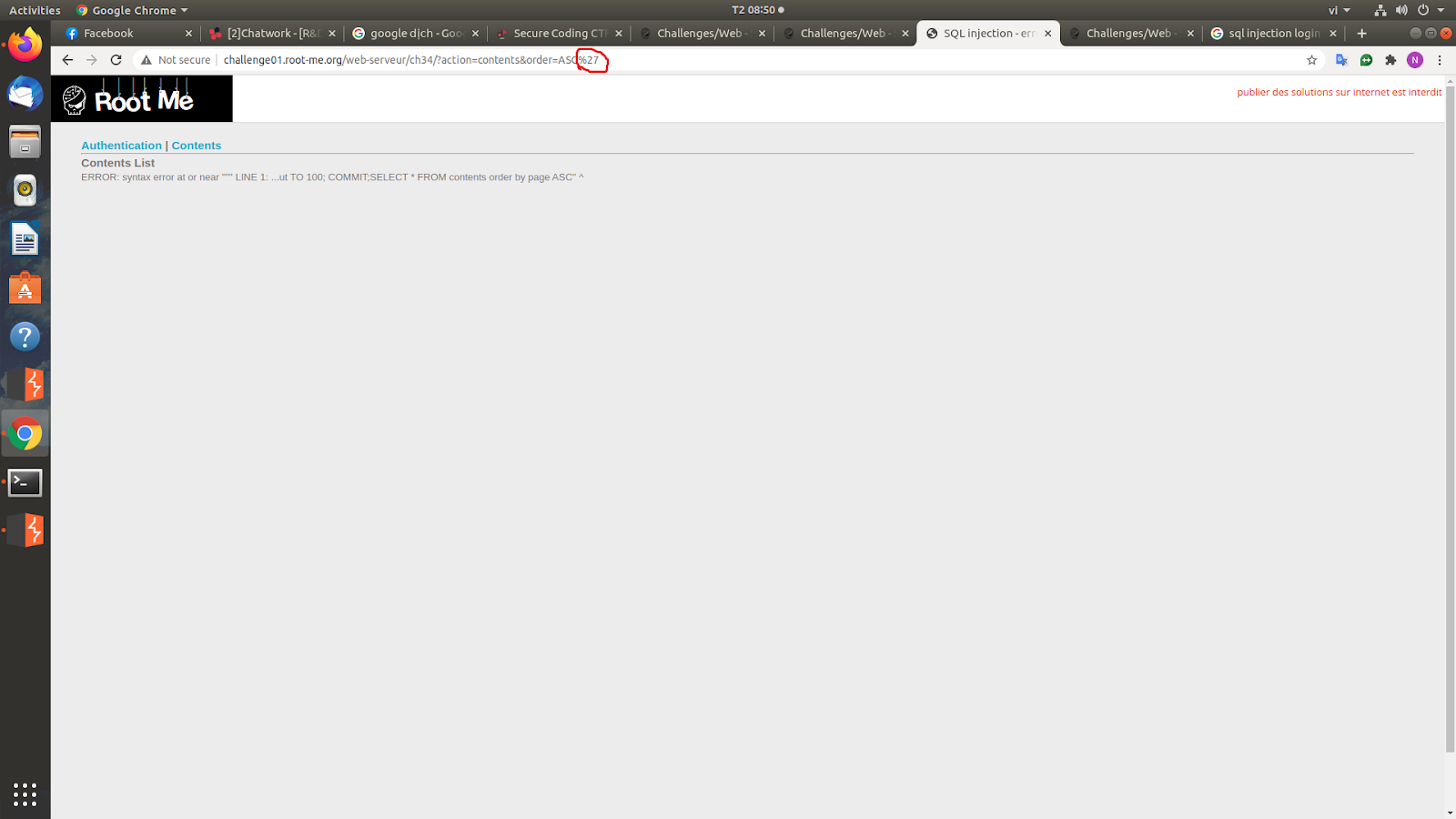 Link: http://challenge01.root-me.org/web-serveur/ch34/ Bài này lỗi sqli nằm tại page Contents. Thực hiện vào trang và gõ thêm ký tự ‘ ở cuối url sẽ xuất hiện lỗi: