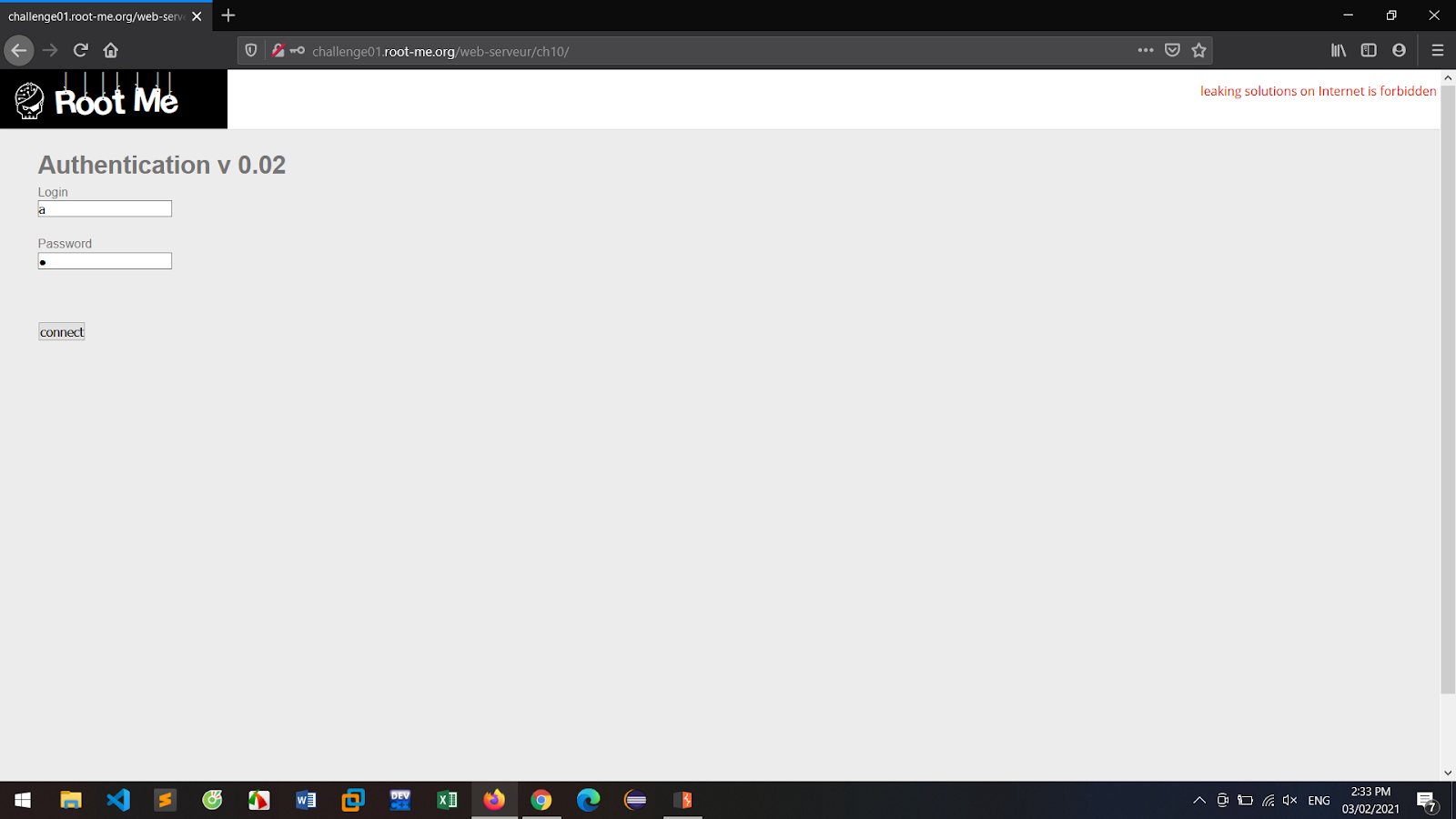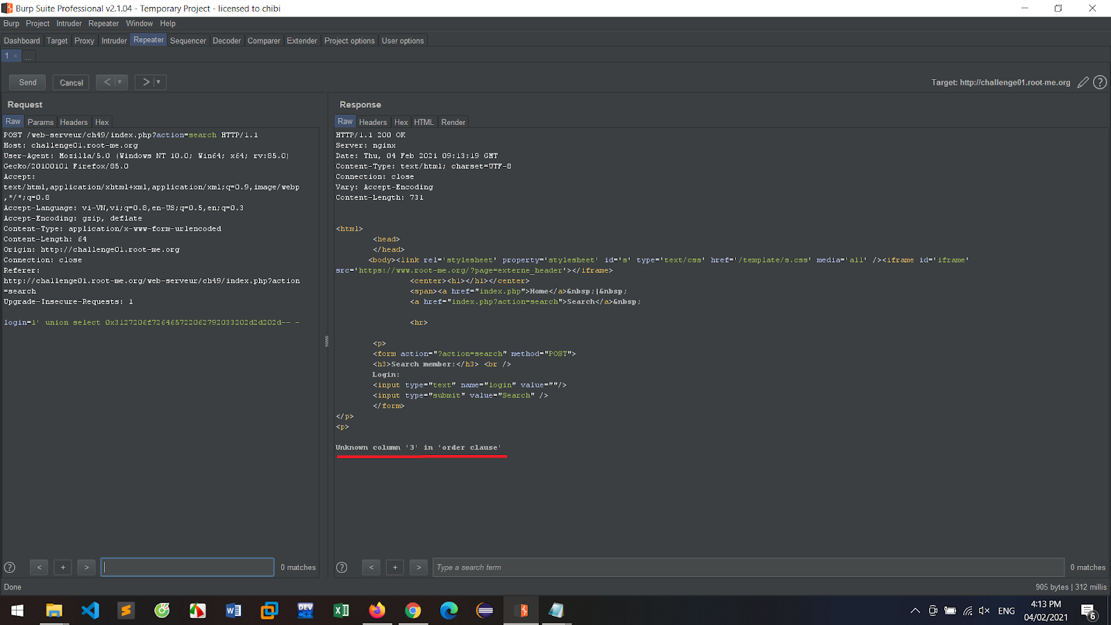 Link: http://challenge01.root-me.org/web-serveur/ch10/ Bài này cho ta 1 trang đăng nhập. Thực hiện đăng nhập vào và kiểm tra khai thác sqli thì không có kết quả trả về -> đây là dạng blind sql injection. Bài này sử dụng phương thức POST để truyền truy vấn nên ta sẽ bắt bằng burpsuite