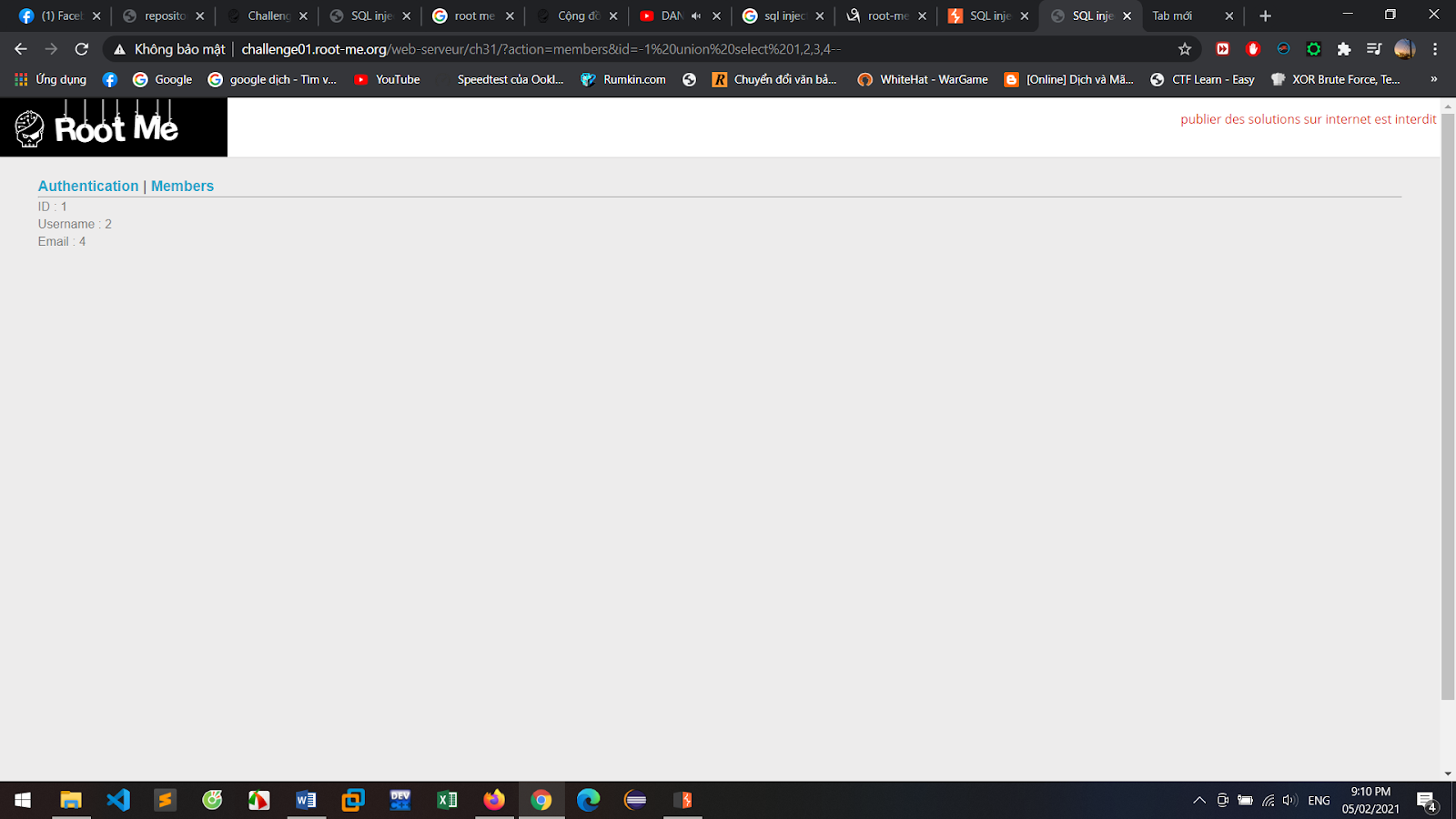 Root me là 1 trang web chơi ctf miễn phí bao gồm rất nhiều dạng từ crypto, forensic, web. Đây là 1 trang rất phù hợp cho những người mới bắt đầu học do nó bao gồm những bài từ đơn giản đến phức tạp, được chia thành các challenge rõ ràng. Hôm nay ta sẽ tìm hiểu các bài về khai thác sql injection trên root me.