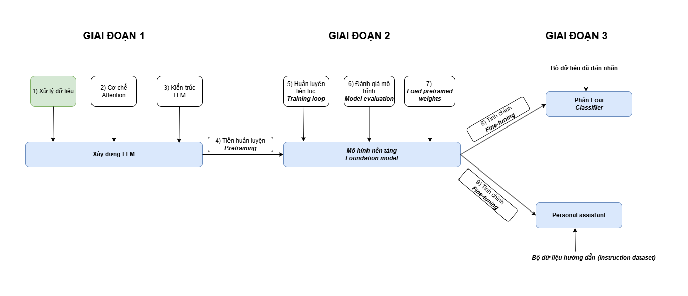 Chúng ta cùng xem lại tổng qua toàn bộ quá trình xử lý văn bản trước khi đưa vào mô hình ngôn ngữ lớn dưới đây